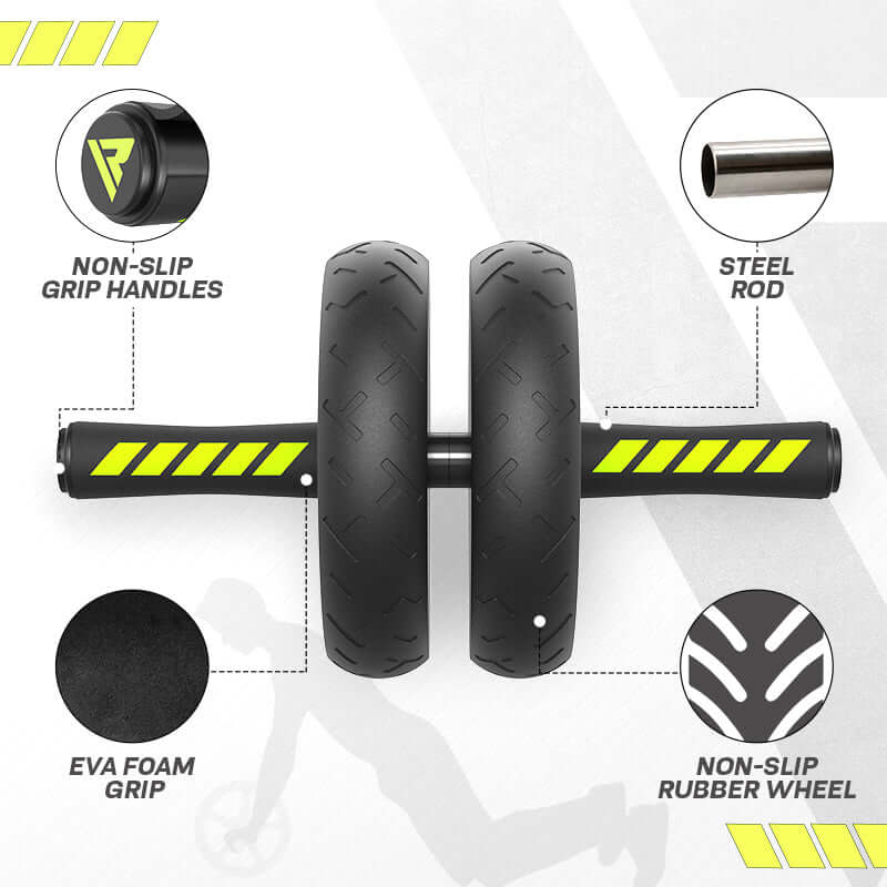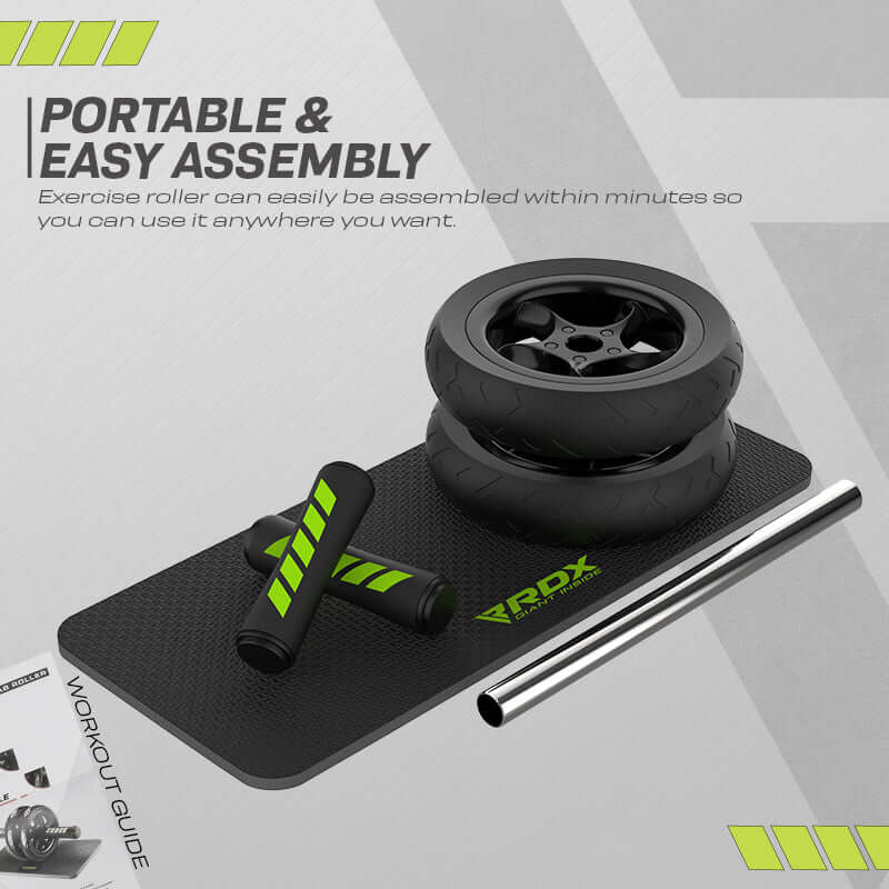 RDX Dual ab wheel roller is built to achieve fitness goals. Compact design abdominal exercise equipment tones abs, back muscles, shoulders and engages your body to build endurance. Rust-resistant stainless steel handles with non-slip EVA foam grip delivers smooth exercise experience and strength. Sculpt your core with portable and compact design of our ab wheel roller, made specifically for training at home gym. Sturdy, durable ab roller wheel builds strength and endurance. Easy to assemble wide dual glide wheel settings for beginners and pros. Comes with a lightweight and soft foam knee pad for extra grip during high-intensity workouts. Ab wheel ultimate core trainer features a height of 15cm with total length of 30cm in which each handle has 12cm length. Knee mat for strength training equipment has a total length of 34cm with 16.5cm width and a perfect thickness of 1.0cm. Abs roller comes in eye-catching combination of green and black colour and a comprehensive exercise manual so you can achieve your fitness goals with ease.