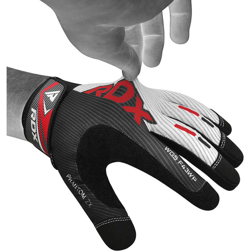 RDX brings you the perfect partner to push your limits and conquer your goals - F43 gym gloves. Full finger training gloves are made of lightweight and breathable spandex material while the palm area is a perfect combination of microfiber and silicone grip with G-FoamTM padding inside. Non-slip silicone palm design on top of microfiber layer for extra grip and palm protection. Quick dry, easily washable pure cotton towel material at thumb for wiping off sweat and keeping hands dry during training at home or gym. Training gym gloves come with touchscreen friendly conductive silicon ink layer that allows you to easily use electronic devices during workouts. Highly adjustable quick on and off, hook and loop closure mechanism makes the workout gloves easy to wear.